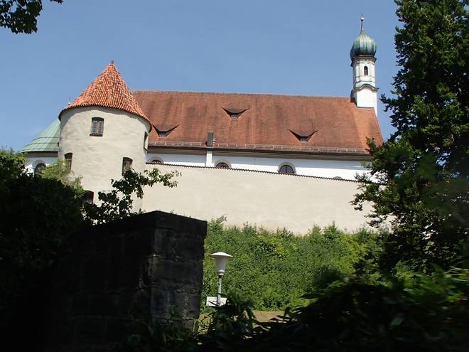 Promenade Lechuferweg 11.53 Uhr / Km 41,4 Hinter der Brücke Lechhalde das Benediktinerkloster St. Mang. |