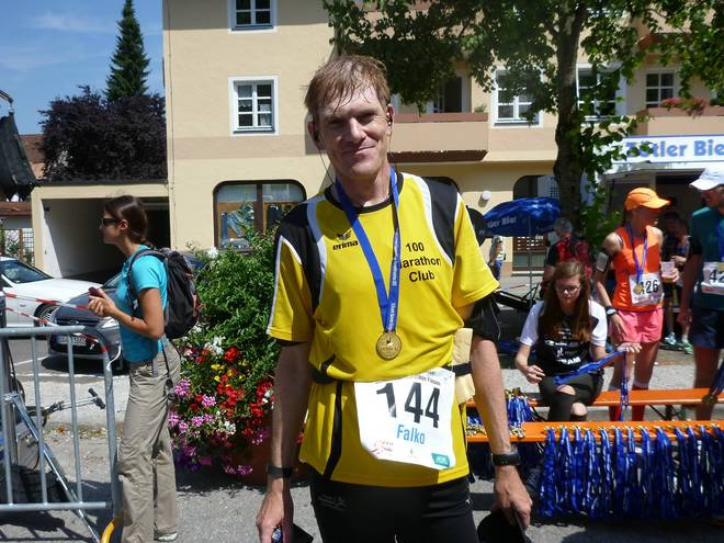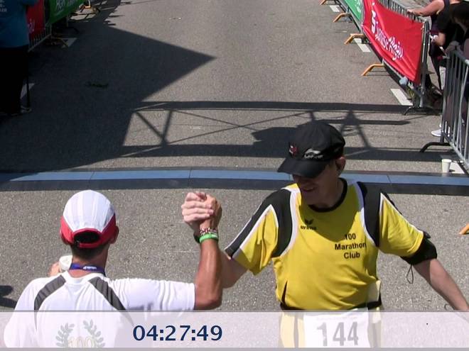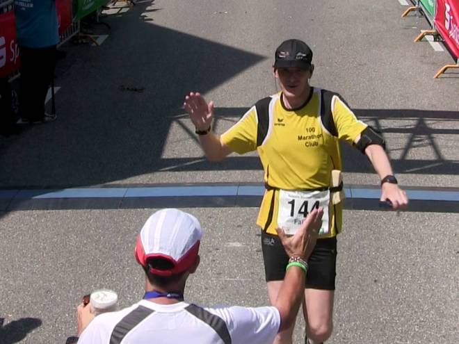 Kemptener Straße 11.58 Uhr / Finish Er hatte gerade seinen 100. Marathon gefinisht. 4:00:06 Stunden hatte er gebraucht. Glückwunsch. Foto: Davengo.com |