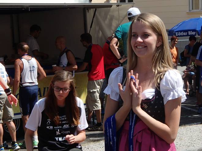Kemptener Straße Von der netten Damen bekam ich schon am Vortag meine zwei Medaillen zum Zehn-Kilometer-Lauf und dem Halbmarathon. Dirndl gab es aber nur für den Marathon. |