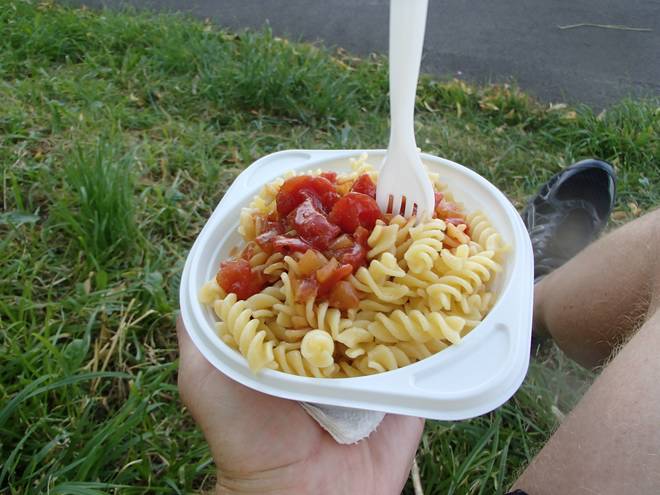Parkplatz an der Morisse Nudelparty nach dem Lauf. Auch nicht übel. Der Gutschein vom Samstag galt auch noch am Sonntag. Samstag hatte ich wegen des Zehn-Kilometer-Laufs und des Halbmarathons keine Zeit für die offizielle Pasta-Party. |