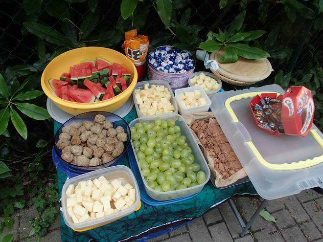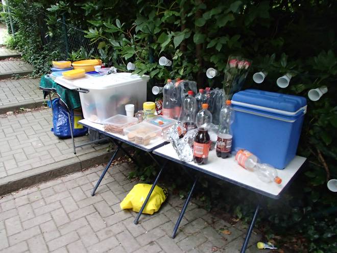 Volksdorfer Teichwiesen 13.57 Uhr Der Verpflegungstisch, den Christine zusätzlich zur üblichen Verpflegung aufgestellt hatte, war erstklassig. Das schlug sogar ich trotz meiner Magenprobleme zu. |