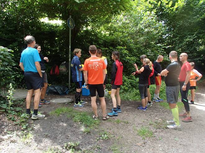 Volksdorfer Teichwiesen 14.06 Uhr Zwanzig Läufer hatten sich an jenem Nachmittag für Christines Jubiläum zum Marathon eingefunden. Das war das größte Feld, welches daß ich je an den Teichwiesen erlebte. |