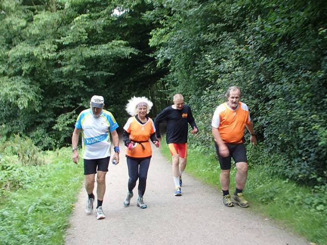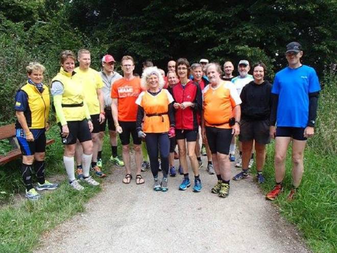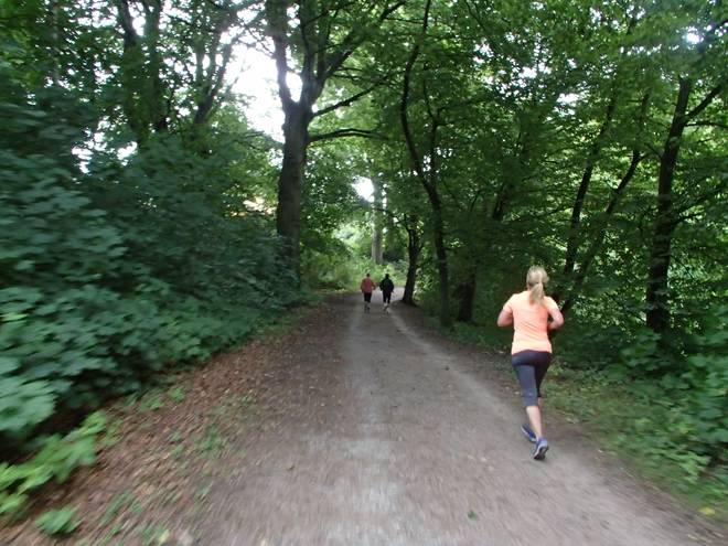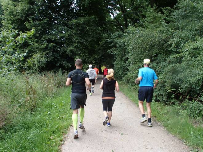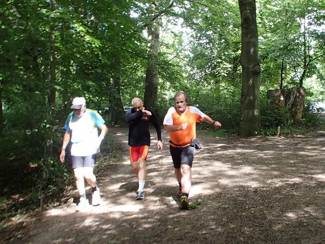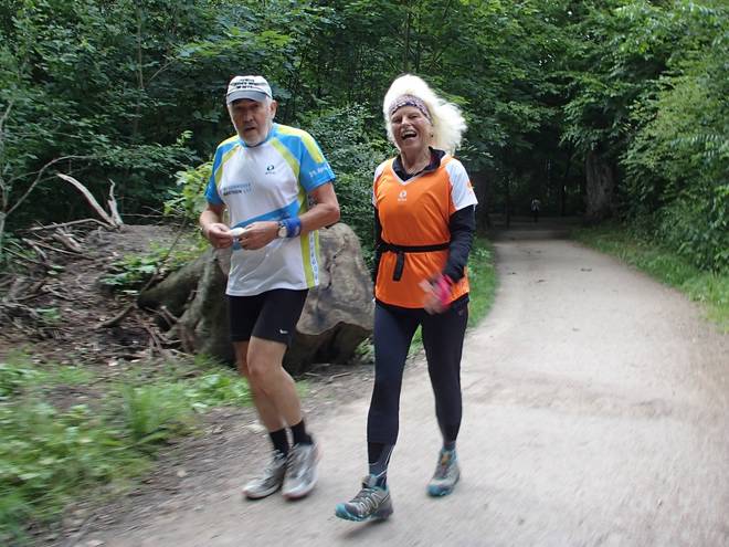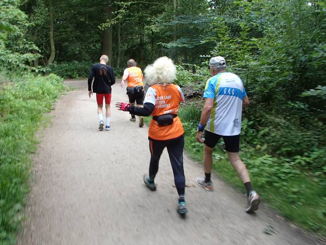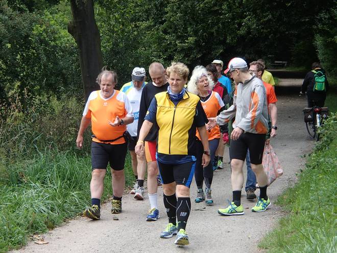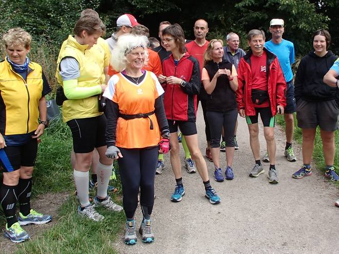 Volksdorfer Teichwiesen 14.31 Uhr Die Jubilarin (fröhlich wie immer) vor dem Rest der Läuferschar. Gibt es an den Teichwiesen auch ein Teilnehmerlimit? |
