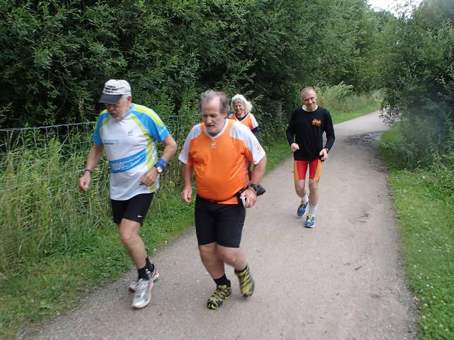 Runde 1 14.38 Uhr / Km 1,0 Christine, Christian, Günter und Meinulf auf den letzten Auftakt-Metern. Ich war schon auf den ersten Metern der ersten vollen Runde. |