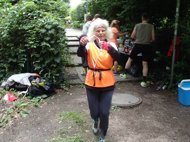 Runde 17 18.40 Uhr / Km 43,2 Die ersten 850 Meter ging ich. Etwas Pause konnte ich gut gebrauchen und die Coca-Cola trank sich so schlecht beim Laufen. Eigentlich hätten so 600 Meter gereicht, aber da ging es immer wieder leicht bergan und da kam ich nicht wieder in Tritt. |