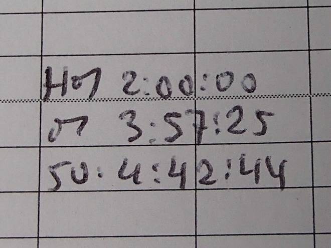 Runde 19 19.15 Uhr / Km 49,99 Zweimal war ich hier schon 50 Kilometer gelaufen. Erst 4:44:44 Stunden und dann 4:44:00 Stunden. Nun kamen noch 4:42:44 Stunden dazu. 12:40 Minuten Runde 19. Das war sogar noch 16,7 Sekunden schneller als die Runde 16. |