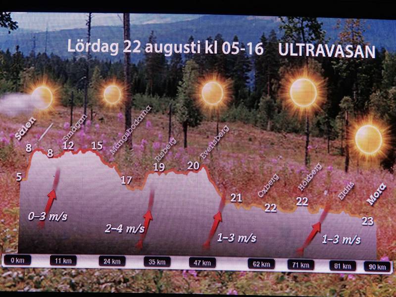 Vasagatan Mora 0.17 Uhr Die ganze Woche vor dem Lauf wurde ich mit Warnungen vor der voraussichtlichen großen Hitze während des Laufes gewarnt. Und die Schweden meinten mit Hitze tatsächlich die bis zu 23°C, die hier auf dem Wetterbericht zu sehen sind. Daß es in der Nacht und auch am Start arschkalt sein würde, davon war nie die Rede. |
