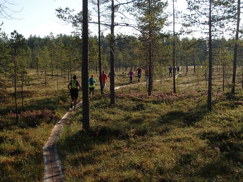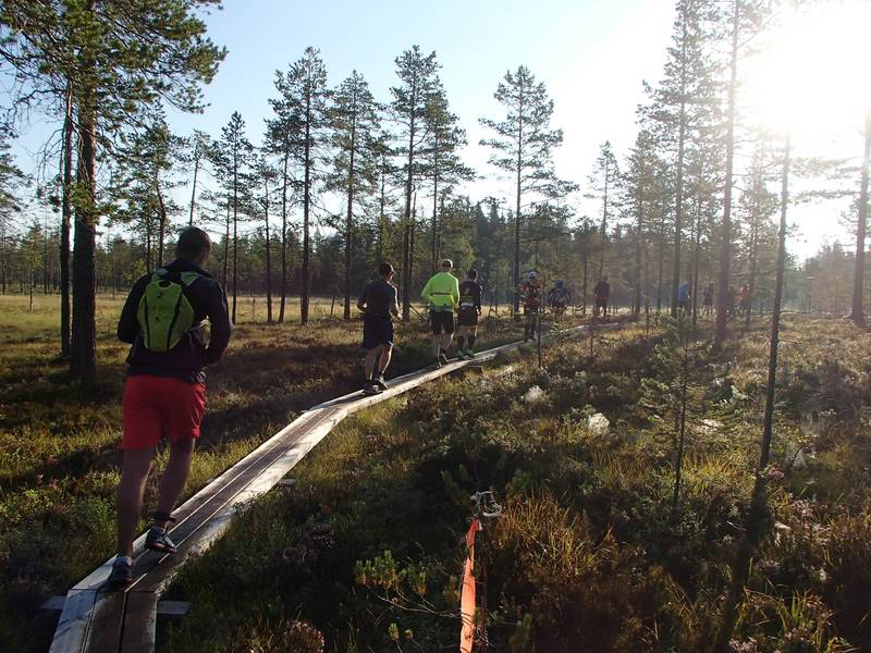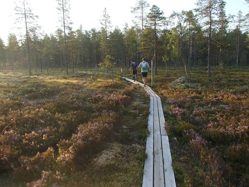 7.23 Uhr / Km 18 Im Winter ist das Moor hier gefroren und man läuft hier auf der ganzen Breite quer zur Laufstrecke durch. Im Sommer hat man nur den schmalen Weg auf den Holzplanken. Und da ist der Platz sehr limitiert. |