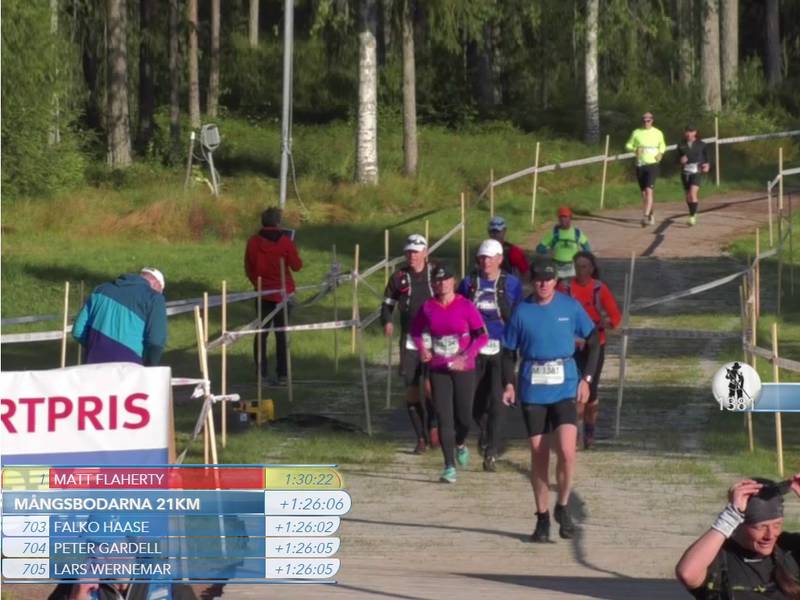 Måndsbodarna 7.57 Uhr / Km 23,4 2:56:24 Stunden brutto und offiziell auf der Uhr. Das Limit waren hier vier Stunden. Da lag ich ja locker drunter. Auf den Führenden hatte ich aber schon 1:26:02 Stunden Rückstand. Die Kilometereinblendung stimmt hier genauso wenig wie die in Smågan früher. Foto: Motion 4 Life |