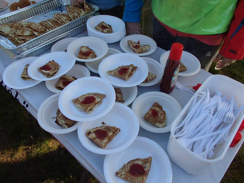 Måndsbodarna 7.59 Uhr / Km 23,4 ... und Pfannkuchen. Da schlug ich doch mal zu. Ein Brötchen, etwas Wurst und natürlich einen Pfannkuchen. Lecker. |