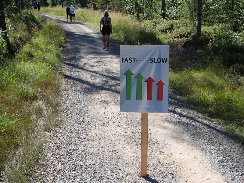 11.59 Uhr / Km 53 Der Hinweis war wegen der bald zu erwartenden Staffel-Läufer notwendig. Die Läufer hatten natürlich ein weitaus schnelleres Tempo drauf. Da aber noch keiner zu sehen war ging ich ganz trotz auf der schnellen Seite vorbei. |