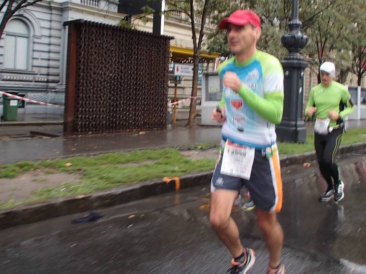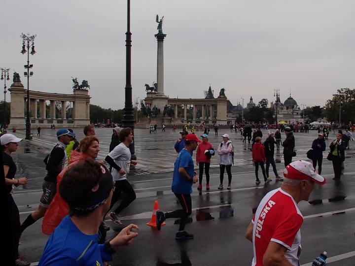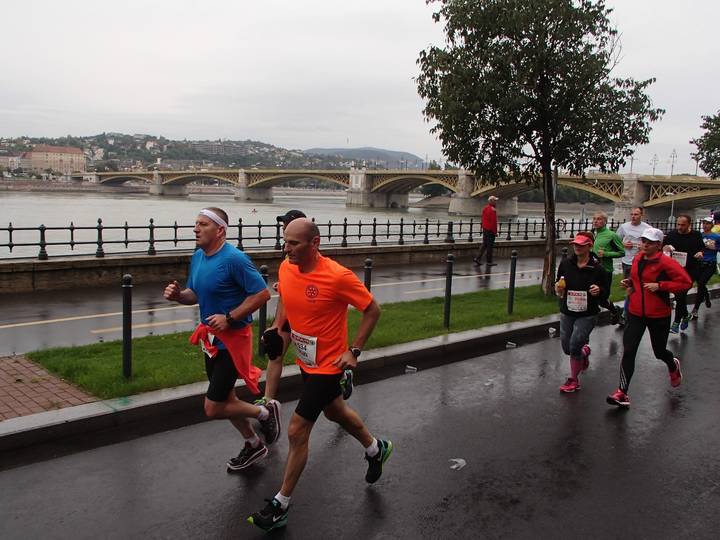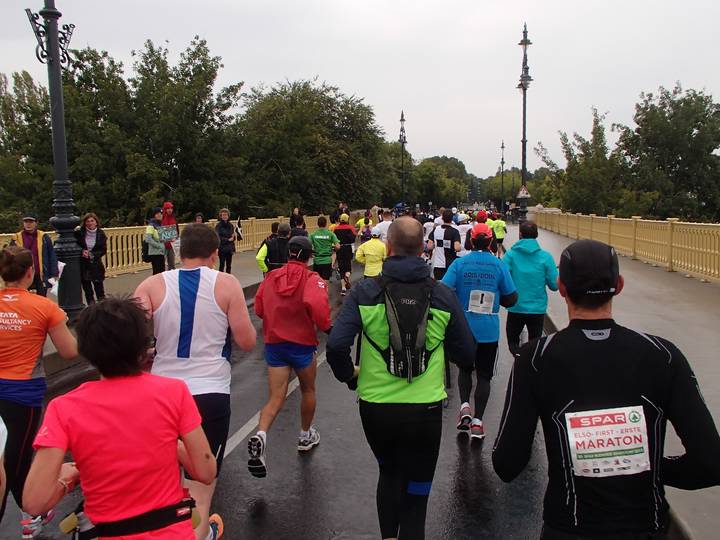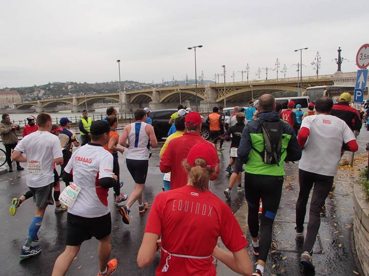 Jászai Mari tér Margit híd 10.46 Uhr / Km 13,0 Wenn ich sagte, es wäre trocken gewesen, dann weil es nicht regnete. Auf der Straße war es teilweise sehr naß. |