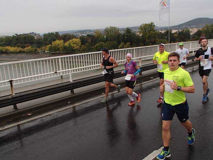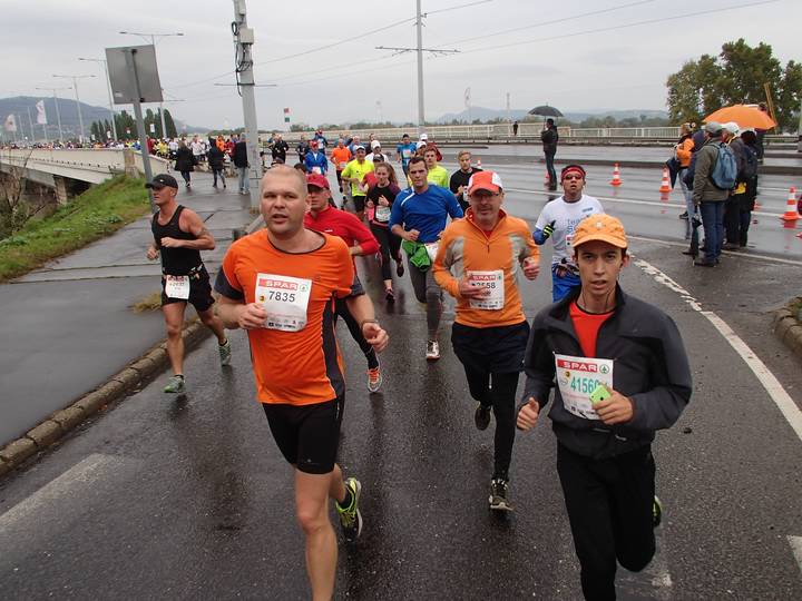 Árpád híd 10.32 Uhr / Km 10,2 Die Regenschirme auf dem Bild sollen nicht darüber hinwegtäuschen, daß es in Wahrheit gar nicht regnete. Grau war es, aber es regnete nicht. |