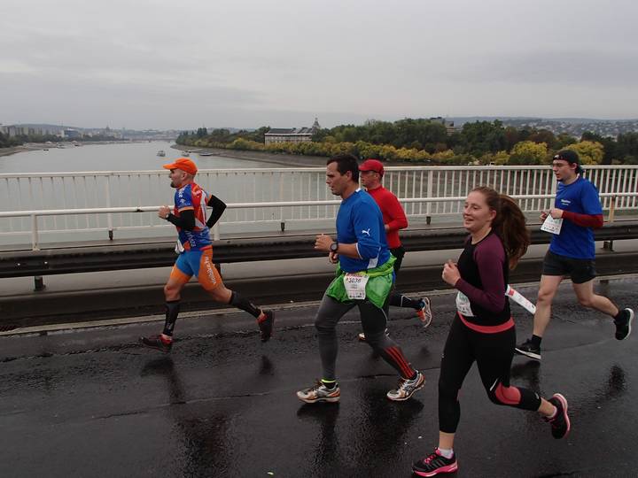 Árpád híd 10.30 Uhr / Km 10,0 55:50 Minuten nach zehn Kilometern. Das war besser als erwartet. Die zweiten fünf Kilometer waren mit 28:15 Minuten zwar 40 Sekunden langsamer als die ersten fünf Kilometer, aber wenn man die Pinkelpause und die Anstieg bedenkt, kommt das ungefähr hin. |