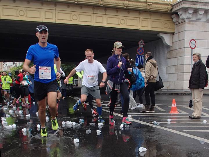 Jászai Mari tér Margit híd 10.46 Uhr / Km 13,0 Dieses Mal ging es aber nur unter der Brücke hindurch. Und zusammen mit der Verpflegungsstelle gab es nun richtig Stau auf der Strecke. |