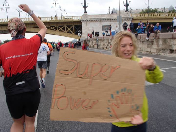 Carl Lutz rakpart 12.17 Uhr / Km 29,7 ... und dann Super Power abholen. Wäre natürlich einfacher gewesen, wenn die Klatschfläche links unten gewesen wäre, aber für ein wenig Super Power muß man sich eben anstrengen. |