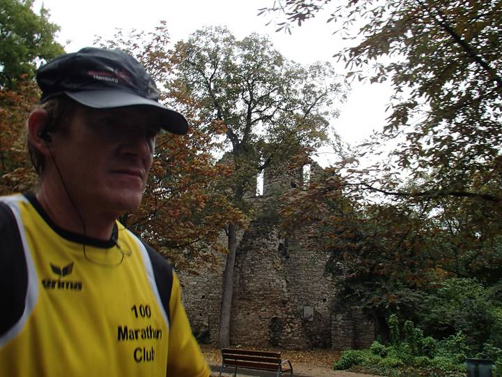 Margitsziget 12.46 Uhr / Km 34,3 Nun hatte ich tatsächlich einen Grund, grimmig in die Kamera zu schauen. Im Hintergrund die Ruine Ferences Kolostorrom. Die hatte ich auf dem Hinweg gar nicht gesehen. Gehen hat auch Vorteile. |