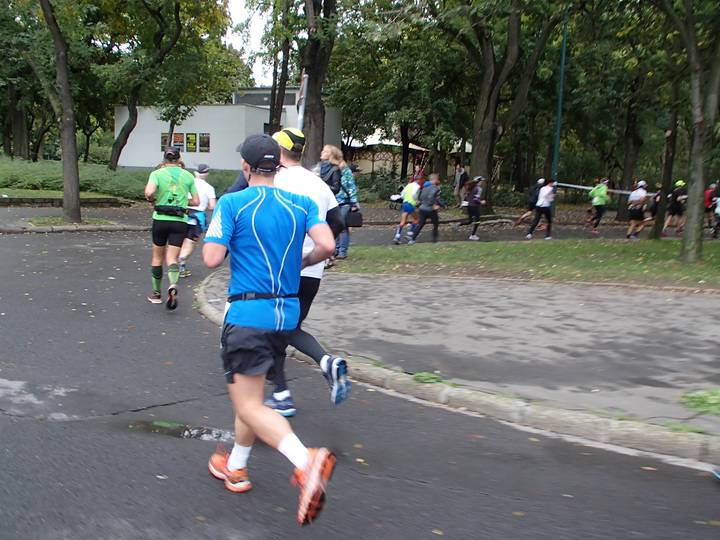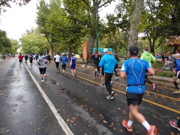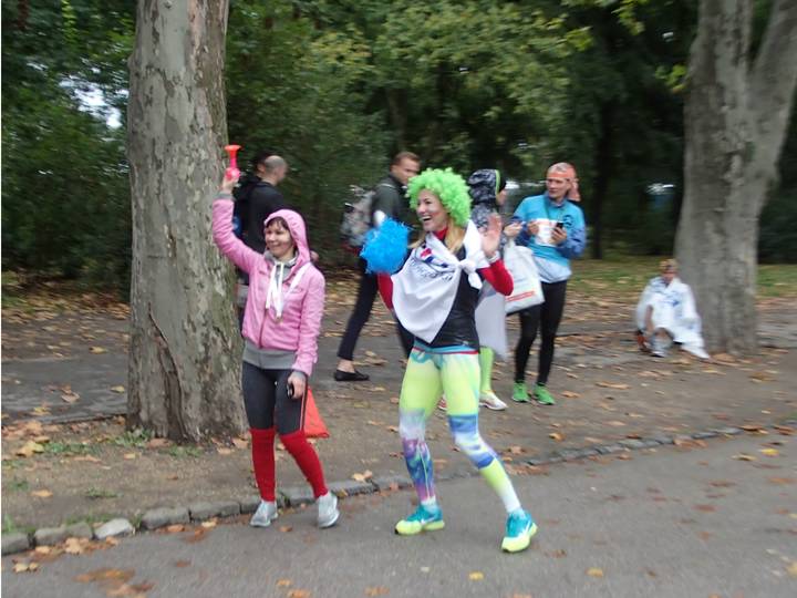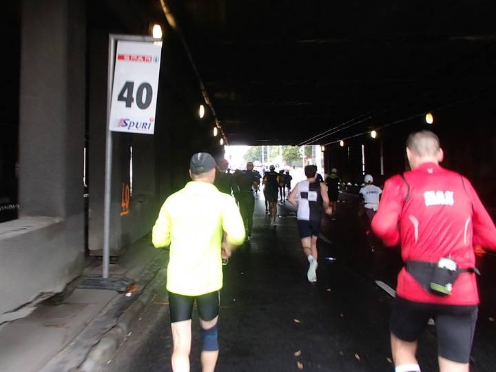 Olof Palme sétány Városliget 13.30 Uhr / Km 41,8 Während ich langsam vor mich hin joggte, zog das Feld im flotten Tempo an mir vorbei. Immerhin würde ich auch mit der Geschwindigkeit noch unter vier Stunden im Ziel ankommen. |
