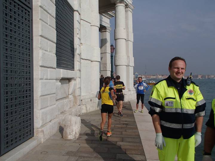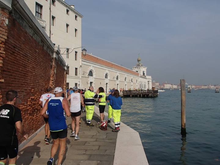 Fondamenta Zattere Ai Saloni Punta della Dogana di Mare Canale della Giudecca 13.24 Uhr / Km 40,1 War auch schon eng genug mit den Läufern und den Rettungskräften. |