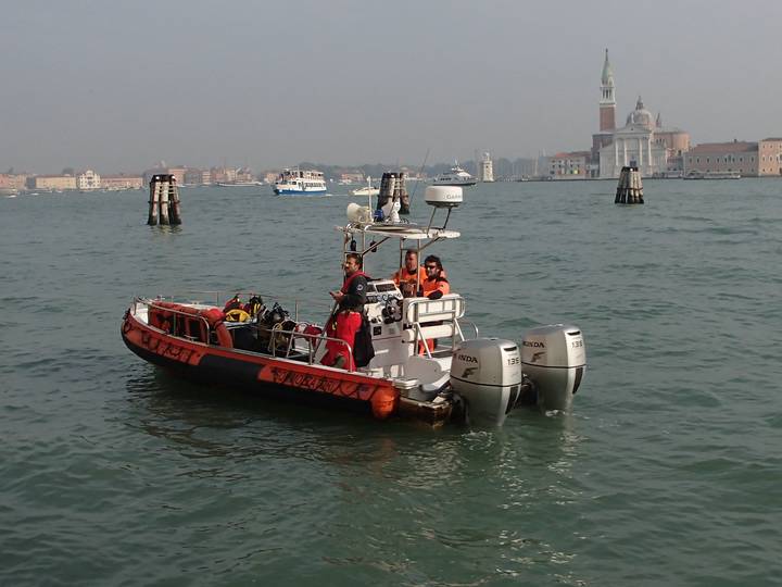 Canale della Giudecca Laguna Veneta Chiesa di San Giorgio Maggiore 13.25 Uhr / Km 40,2 Rettungskräfte auch zu Wasser. Bei Km 40 kann man ja schon mal vom Weg abkommen und ins Wasser fallen. Für einen freiwilligen Gang ins Wasser war es nicht warm genug. |