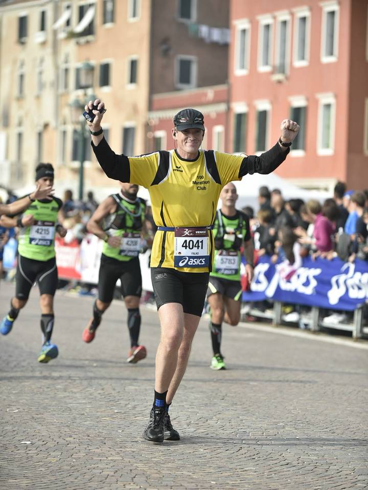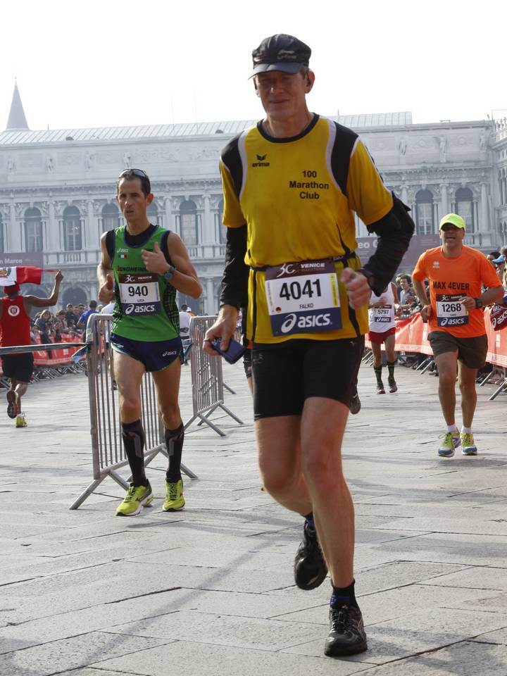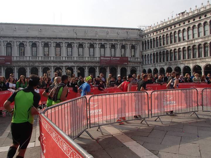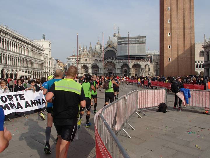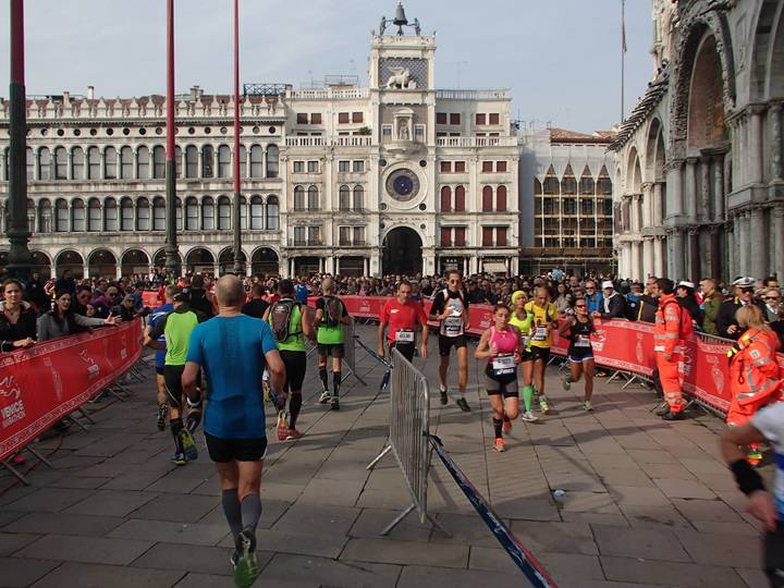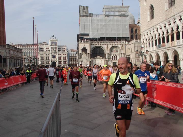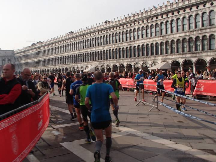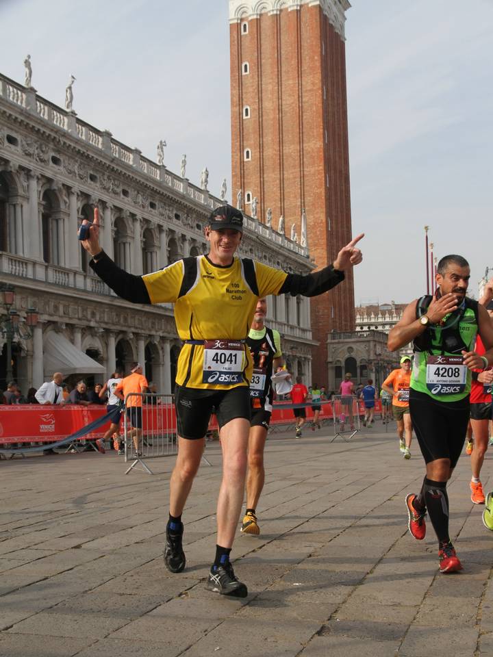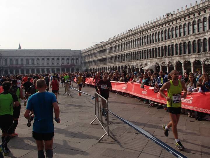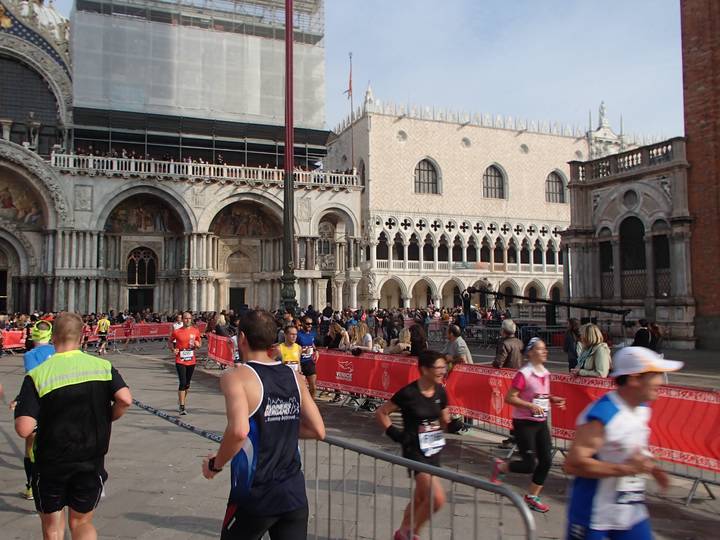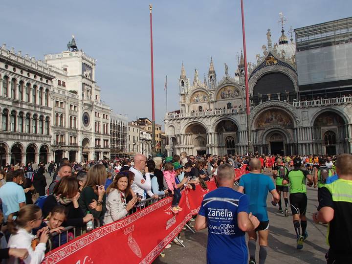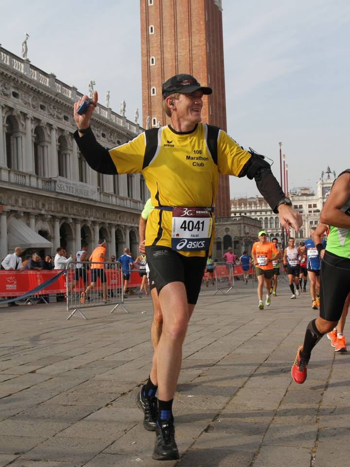 Piazza San Marco 13.29 Uhr / Km 40,9 Da hatte ich vorher gut aufgepaßt, wo sich der Fotograf zwischen den Zuschauern versteckt hatte. Und im richtigen Moment hatte ich meine Kamera mal nicht im Anschlag. Foto: MarathonFoto |