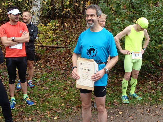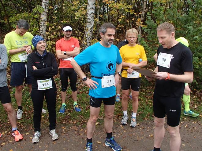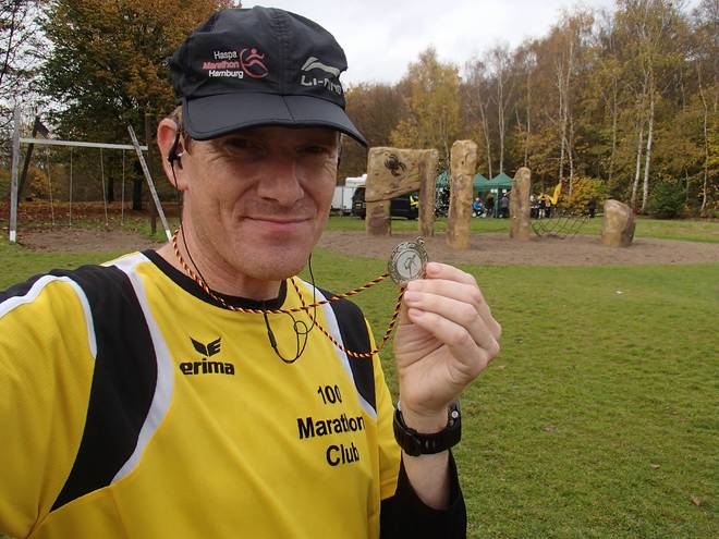 Öjendorfer See 8.57 Uhr Bevor es losging, wurde noch Hanno Höpers für die Absolvierung von 100 Marathons geehrt. Der Lauf war allerdings schon etwas her. Aber hier in Öjendorf läßt man sich doch gerne ehren. Hatte ich 2013 auch so gemacht. |