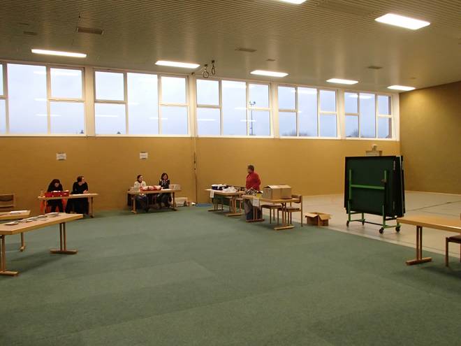 An der Sporthalle 9.44 Uhr Nun dauerte es länger, sich die Startunterlagen zu holen. Und auch die Umkleidekabine war nun sehr voll. Da war es doch gut, schon alles erledigt zu haben. |