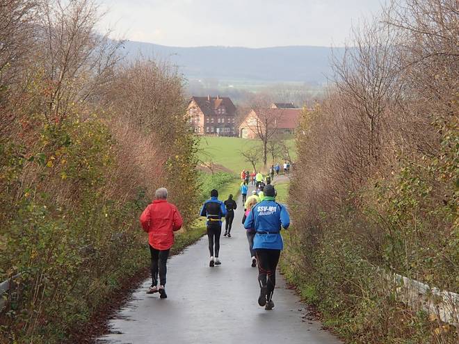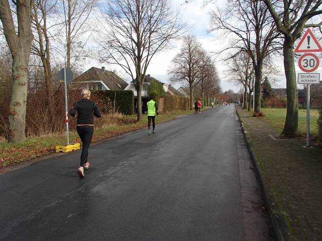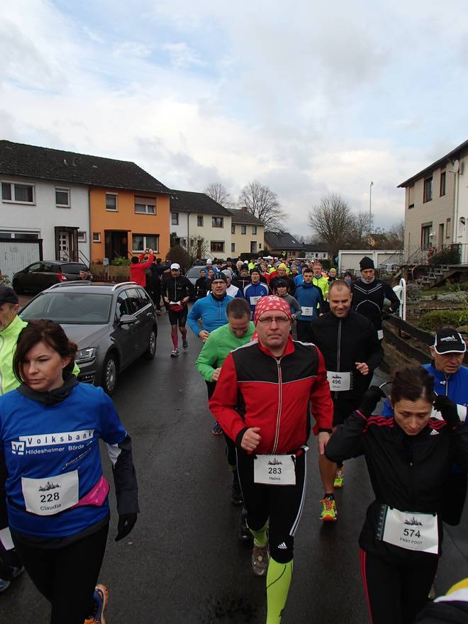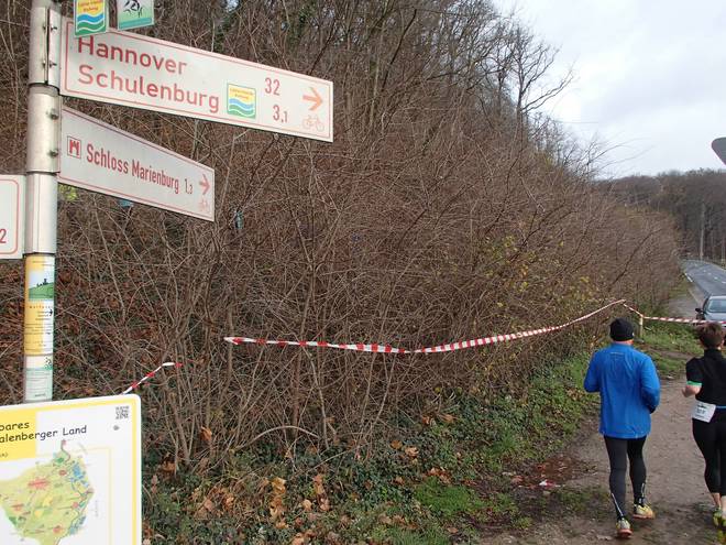 Südstraße 10.01 Uhr / Km 0,2 Zu laufen waren zwei Runden, wobei jede Runde aus einer Ostschleife mit Besuch des Schlosses Marienburg und einer Westschleife über Felder und durchs Hallerburger Holz. Die Schleifen war in etwa gleich lang und endeten jeweils wieder an der Sporthalle. |
