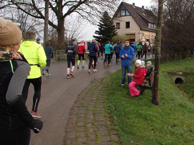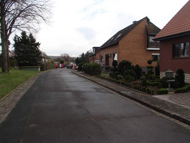 Bergwinkelsweg 10.05 Uhr / Km 0,9 Der Anfang war recht eng, da auf der ohnehin schmalen Straße noch Autos parkten. Aber schon nach 500 Metern hatte sich das Feld sortiert und Laufen war kein Problem mehr. |