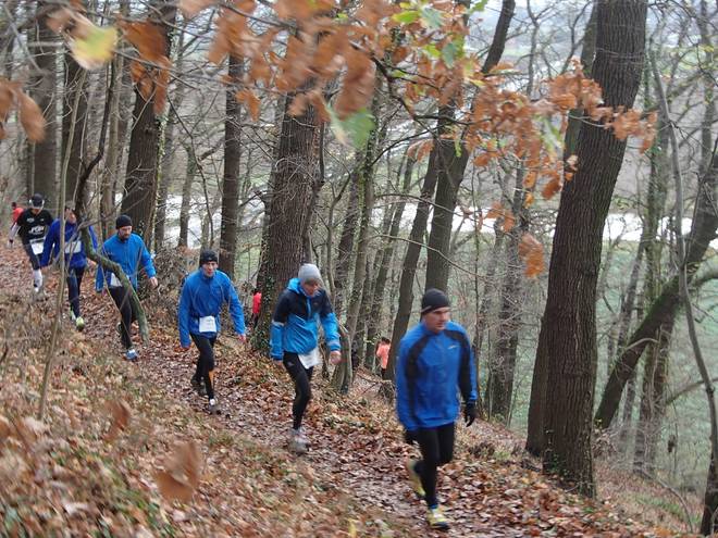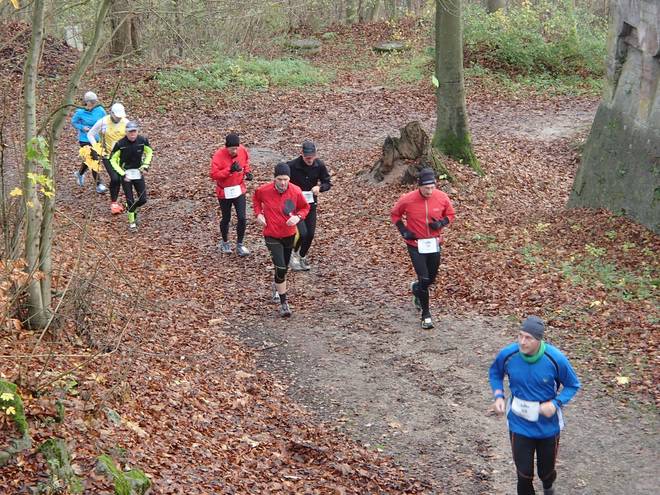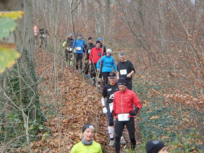Adenser Berg 10.19 Uhr / Km 3,0 Im Wald war es mit Laufen dann erst einmal vorbei. Auf dem schmalen Weg ging es nur im Gänsemarsch voran. Rein theoretisch konnte man durch das tiefe Laub überholen, aber das war viel zu anstrengend. Und man wußte ja nie, was unter dem Laub war. |