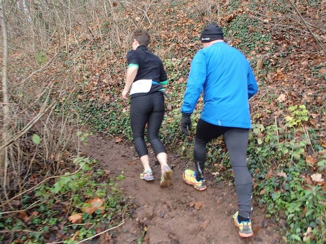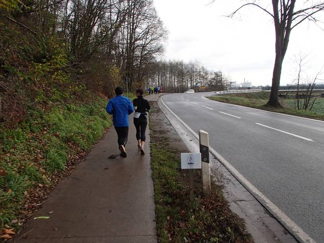 Adenser Berg 10.31 Uhr / Km 4,5 Das Bergab-Stück hatte was. Auch wenn es jetzt nicht mehr regnete, so war es dennoch rutschig. |