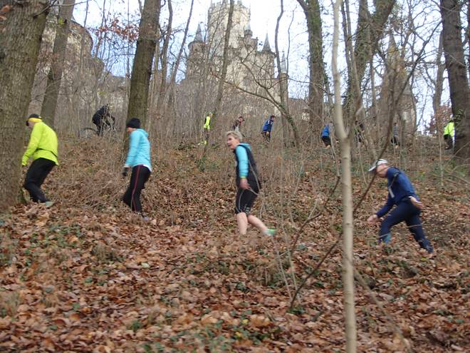 Schulenburger Berg 10.45 Uhr / Km 6,0 Hinter dem Schloß ging es erneut in den Wald. Hier war die Steigung nicht mehr so schwer wie zuvor, aber ein paar Höhenmeter sammelte man auch hier ein. |