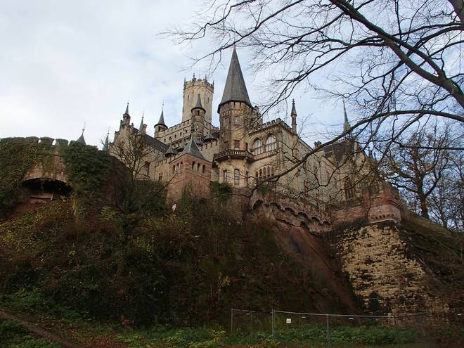 Schloß Marienburg 10.40 Uhr / Km 5,7 Für die Statik ist es natürlich recht gefährlich, das Schloß so nahe an den Abhang zu bauen, für den Ausblick von unten hingegen eine prima Sache. |