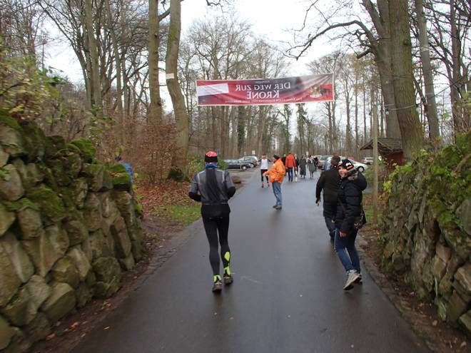Im Mühlentor 11.51 Uhr / Km 16,8 Zurück in den Wald ging es leicht bergauf und nochmals so richtig gegen den Wind. War nicht so schlimm. Unangenehm war nur der Gedanke, das alles noch einmal laufen zu müssen. |