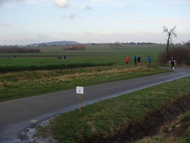 Schrotacker 11.01 Uhr / Km 8,5 Leicht bergab war zwar schön, aber dafür ging es nun auch gegen den Wind. Und der war kräftig und kalt. |