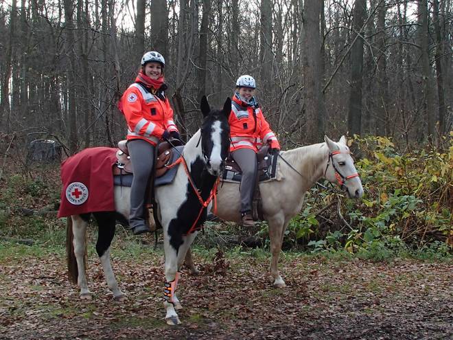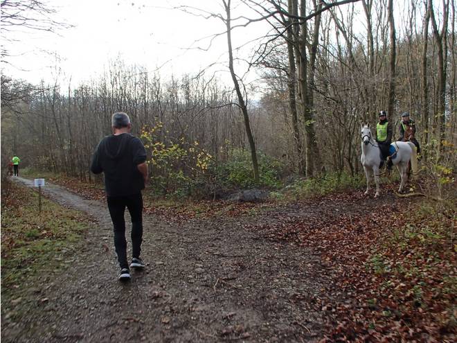 Hallerburger Holz 11.34 Uhr / Km 14,1 An der Strecke gab es nettes Sanitätspersonal. Und alle auf Pferden. Das war mal was ganz anderes. |