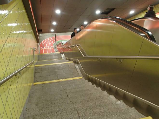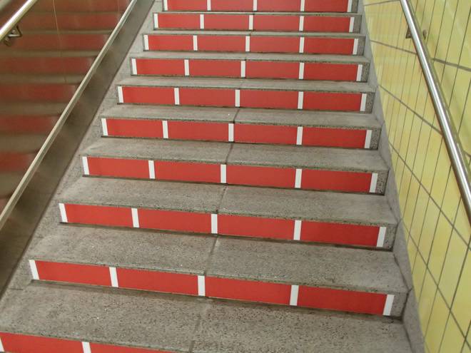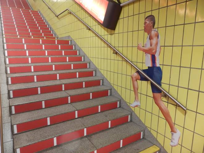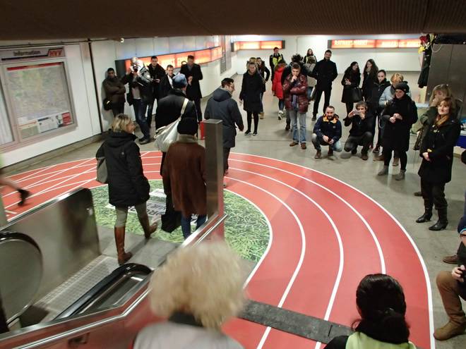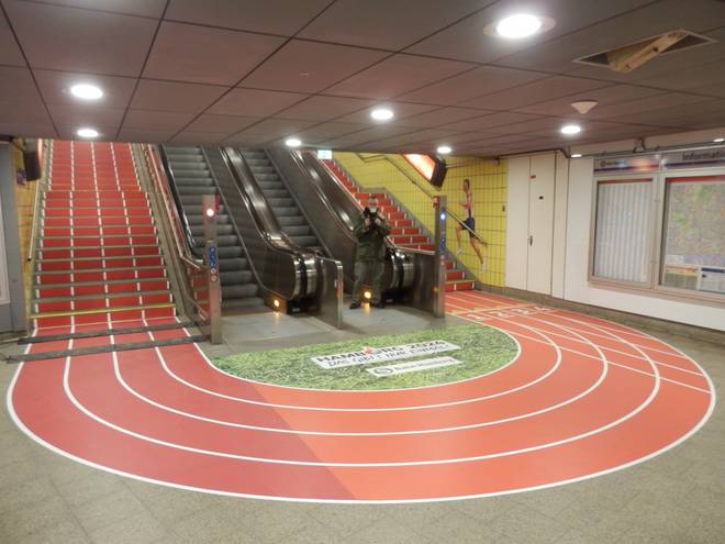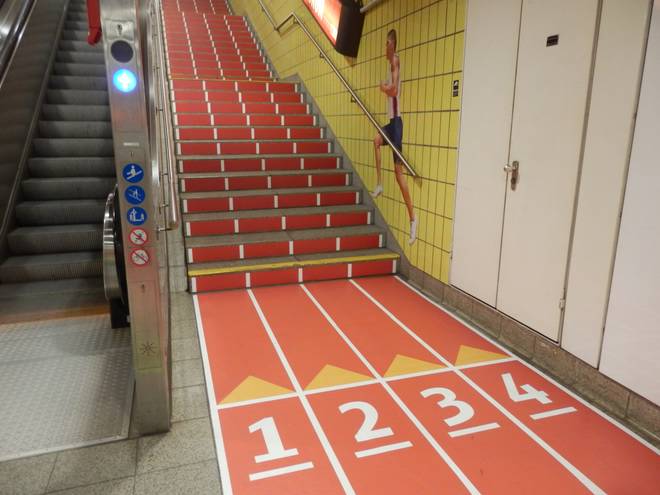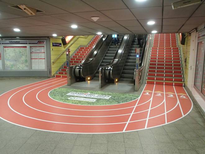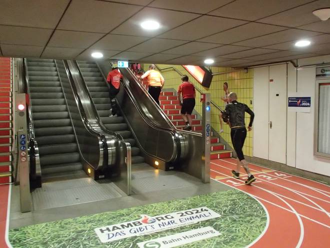 S-Bahn-Station Jungfernstieg Im Zuge Hamburgs Bewerbung um die Olympischen Spiele 2024 dekorierte die S-Bahn-Hamburg den Aufgang zur Station Jungfernsieg im Stile einer Laufbahn um. |