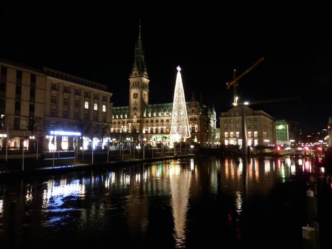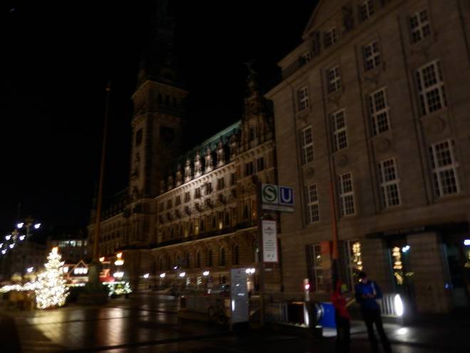 Kleine Alster Rathausmarkt Rathaus Hamburg 26. November 2015 21.00 Uhr Der Tag des Marathons war gekommen. Und Weihnachten war auch nicht fern. Also stand auf dem Rathausmarkt ein Weihnachtsmarkt. |
