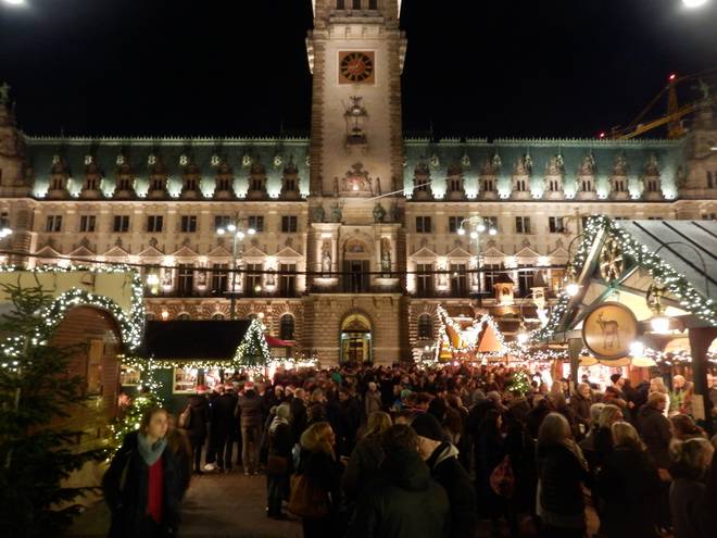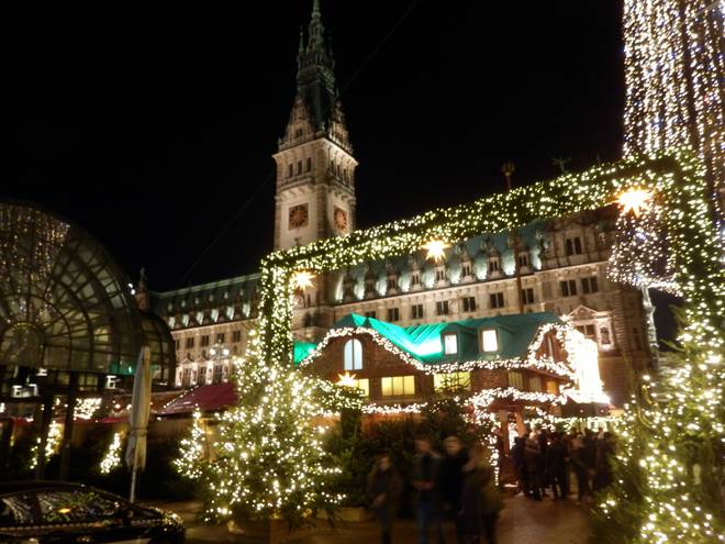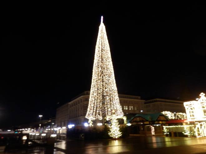 Rathausmarkt 5.16 Uhr Der Weihnachtsmarkt war natürlich geschlossen. Die Lichter brannten aber. |
