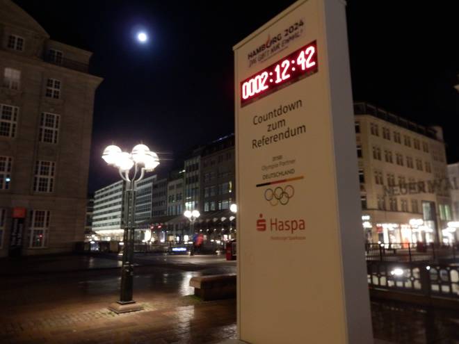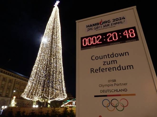 Rathausmarkt Das Olympia-Referendum. Bis zum 29. November 2015 hatte das Hamburger Volk Zeit, für oder gegen eine Bewerbung um die Olympischen Spiele 2024 zu stimmen. Im Hamburger Senat hatte die Bewerbung 91% Befürworter, laut Umfragen waren die Hamburg zwischen 56% und 63% für die Bewerbung, aber der Senat mußte ja unbedingt ein Referendum starten. So dämlich muß man erstmal sein, ab er in Hamburg ist das ganz normal. |