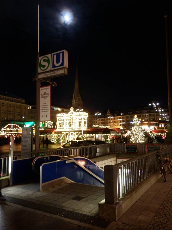 Rathausmarkt Hauptkirche Sankt Petri Eingang S-Bahn Jungfernstieg 21.14 Uhr Hier ging es in den Untergrund zur Rathauspassage und auch zur Marathon-Strecke. |