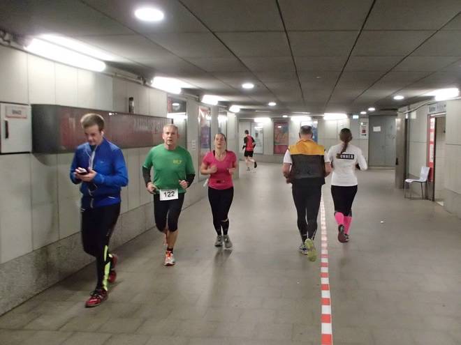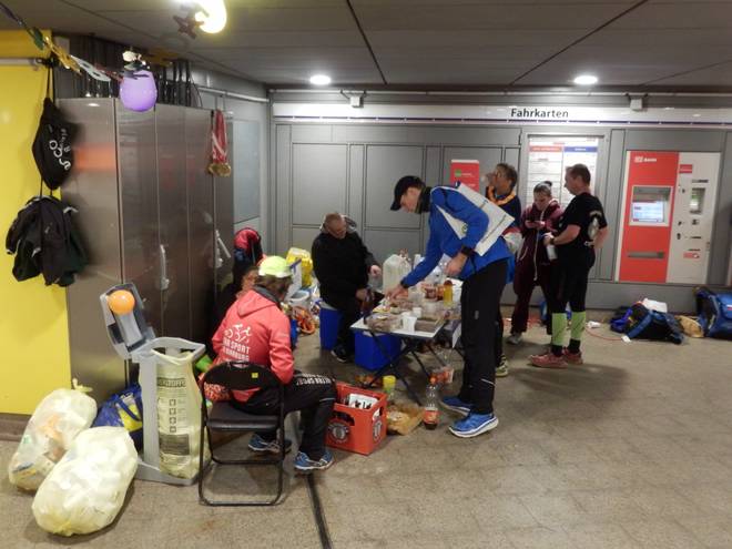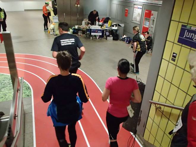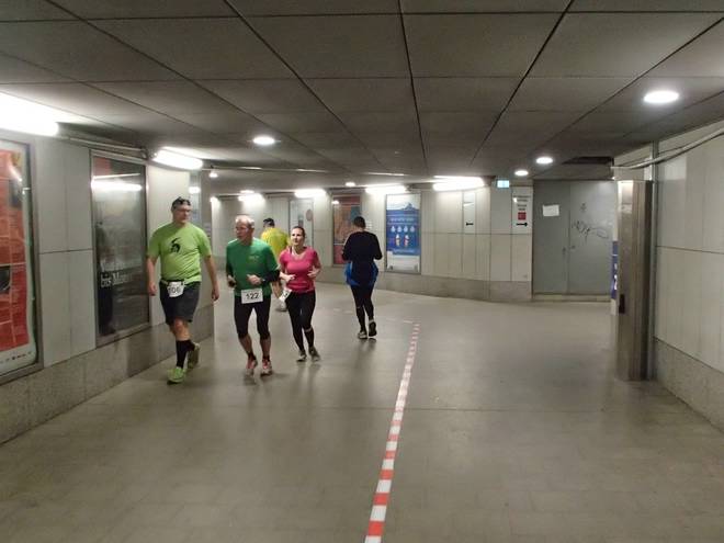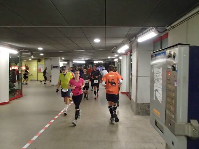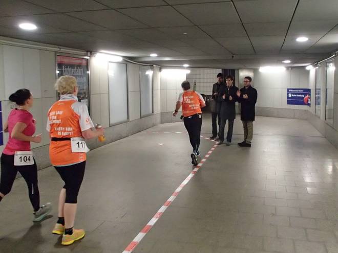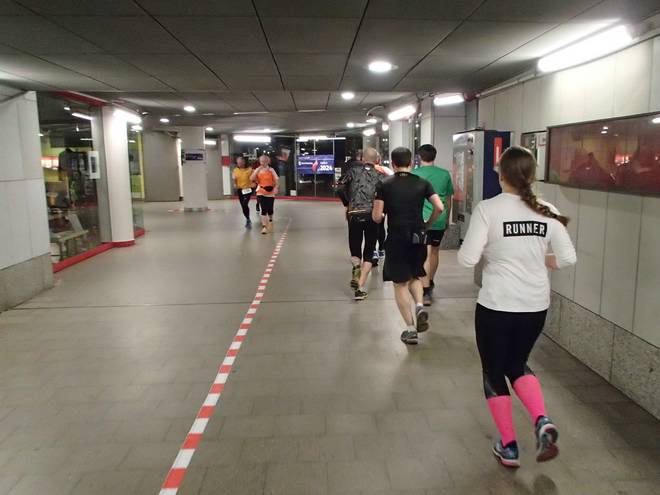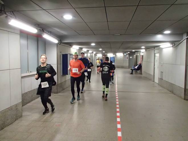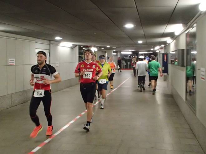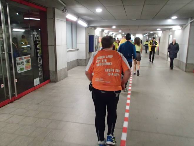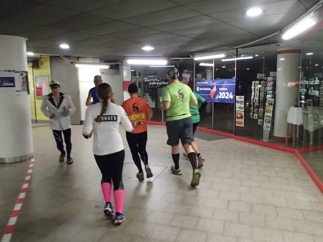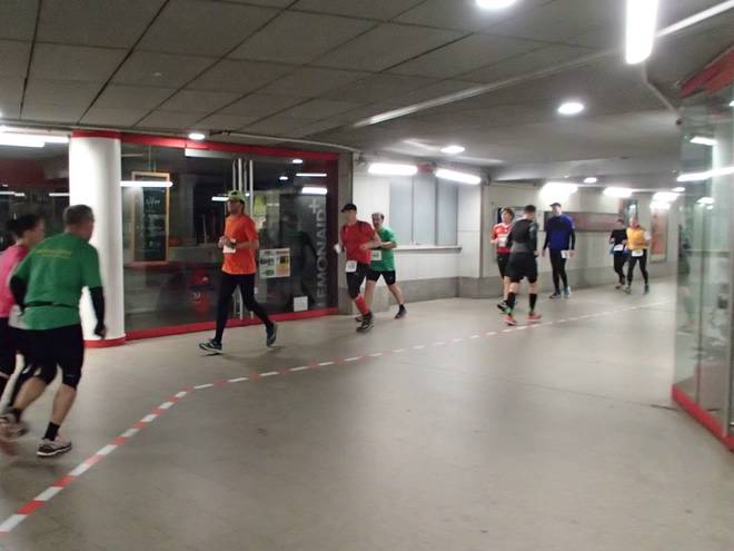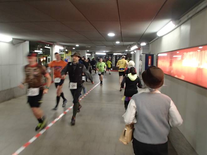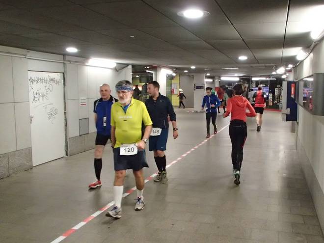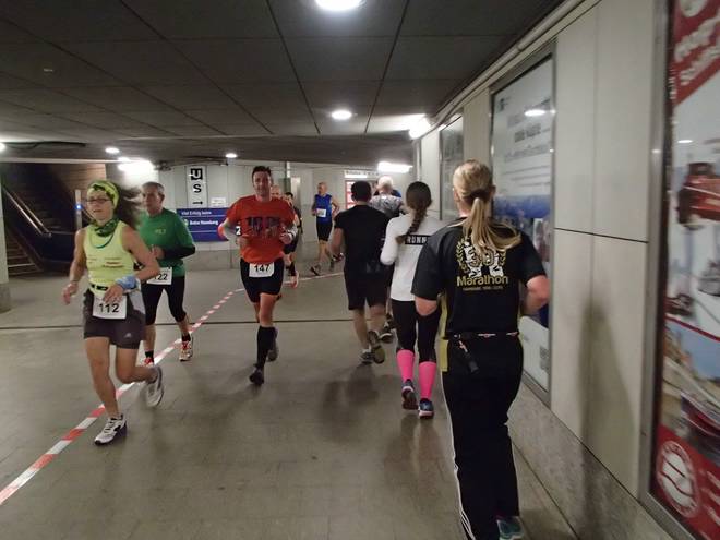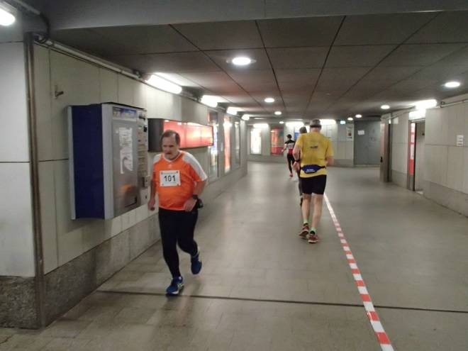 Runde 14 22.28 Uhr / Km 2,0 Nach 17 von 302 Runden legte ich eine Pause ein. Wie viele andere Läufer auch hatte ich mich zu warm angezogen. Also schnell zum Gepäckraum, sonst Aufenthaltsraum des S-Bahn-Personals, und umgezogen. Wenn man direkt an den zwei Ausgängen vorbei lief, kam kurz kalte Luft von oben, aber der Rest der Strecke war eher warm und windstill. |