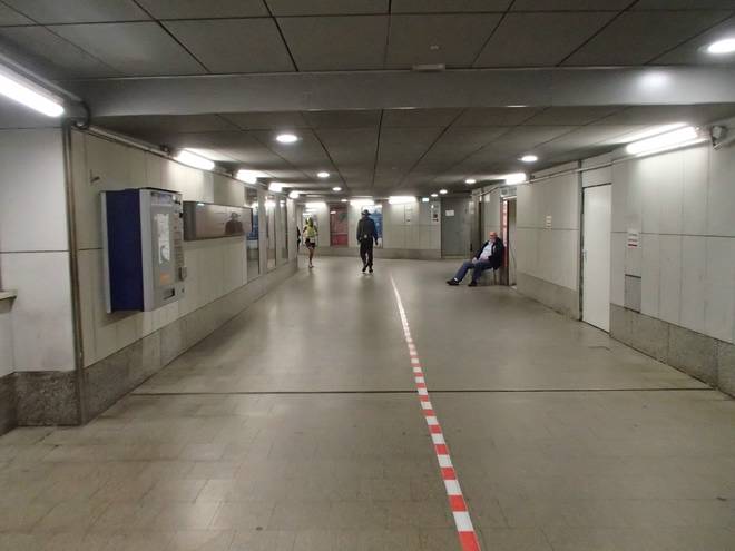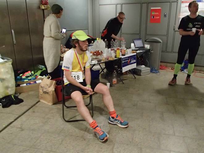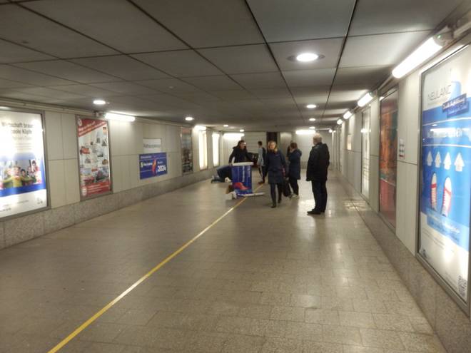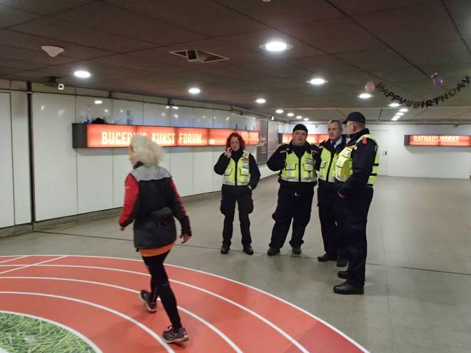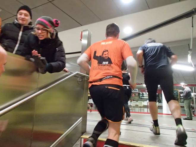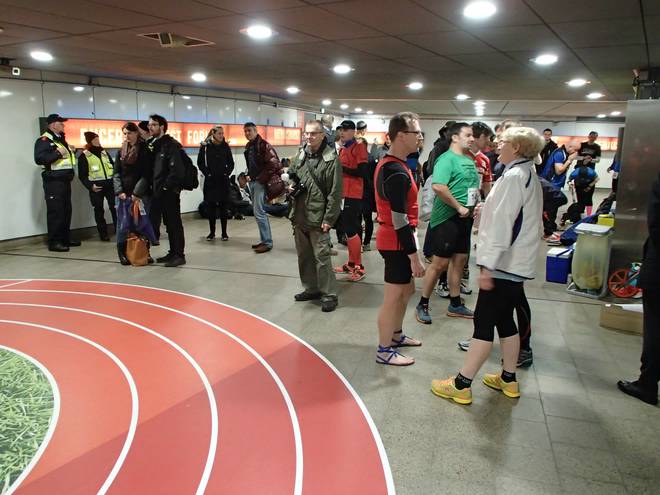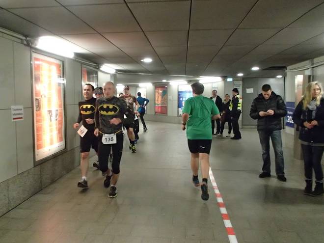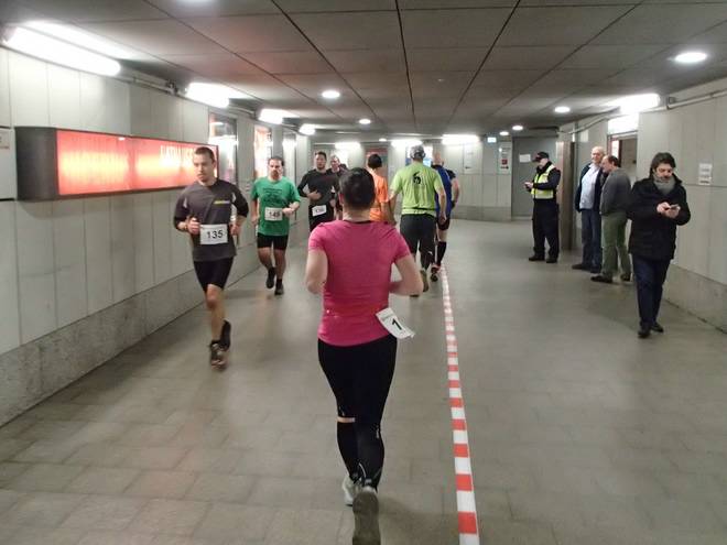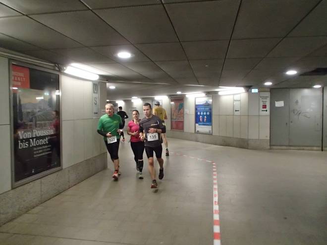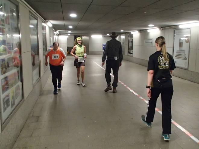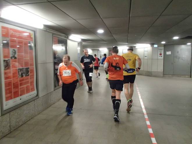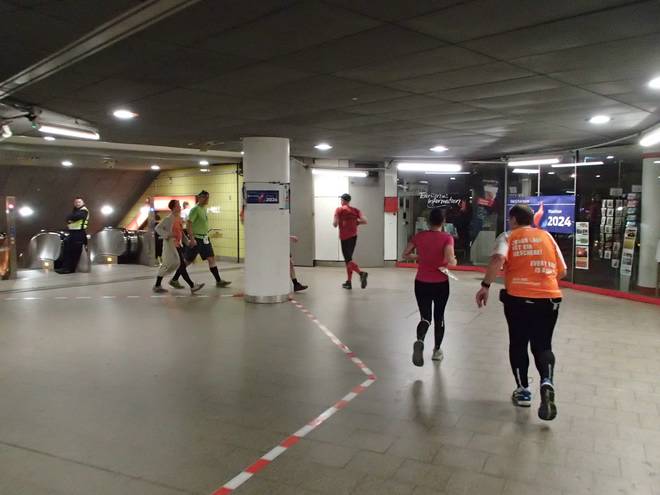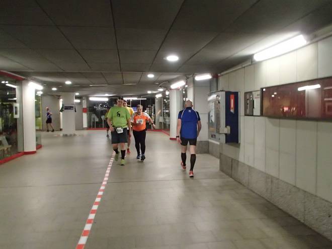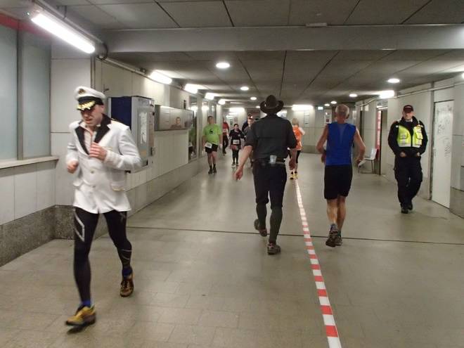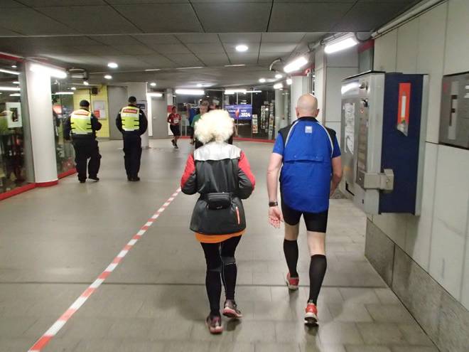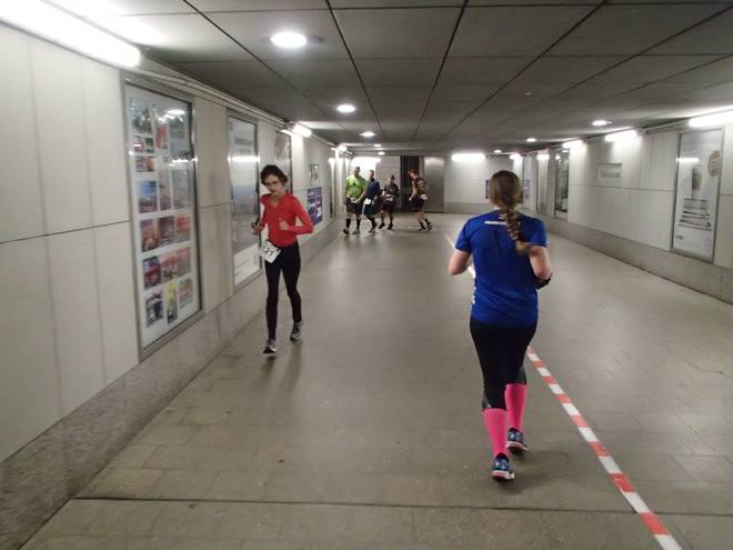 Runde 14 22.28 Uhr / Km 2,0 Nach 17 von 302 Runden legte ich eine Pause ein. Wie viele andere Läufer auch hatte ich mich zu warm angezogen. Also schnell zum Gepäckraum, sonst Aufenthaltsraum des S-Bahn-Personals, und umgezogen. Wenn man direkt an den zwei Ausgängen vorbei lief, kam kurz kalte Luft von oben, aber der Rest der Strecke war eher warm und windstill. |