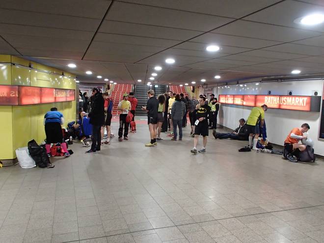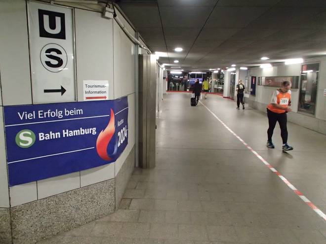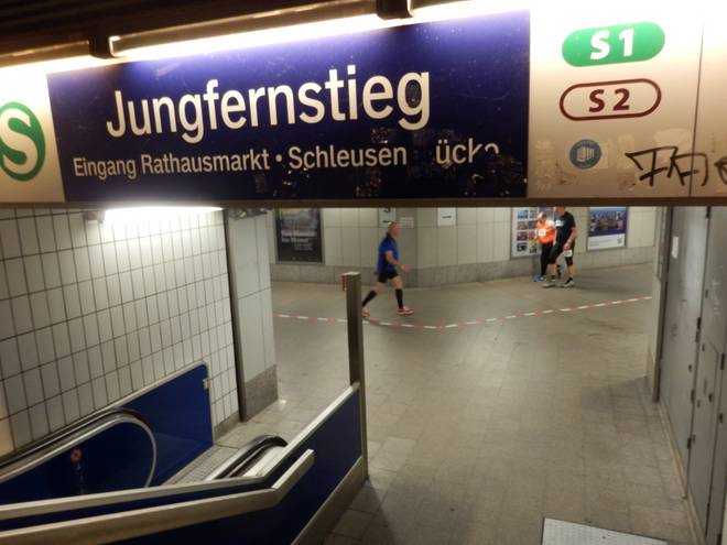 S-Bahn-Station Jungfernstieg Der Marathon war rasend schnell ausgebucht. Trotzdem traten von den 50 Meldern nur 43 tatsächlich auch an. Da hätte man sich ja auch mal abmelden und einem anderen Läufer eine Chance geben können. |