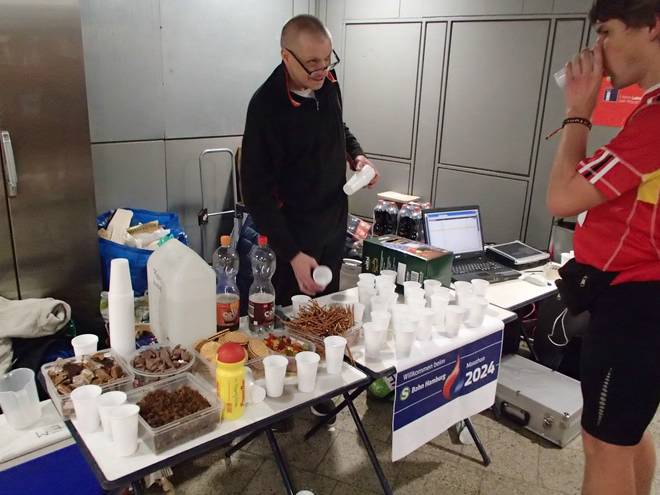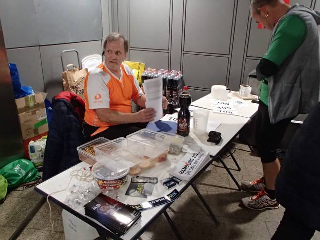 Runde 299 4.45 Uhr / Km 41,86 Die Blicke galten nicht mir. Man wartete hier wohl auf Cornelia Rohwedder, die kurz danach als Damen-Dritte das Ziel ereichte. |