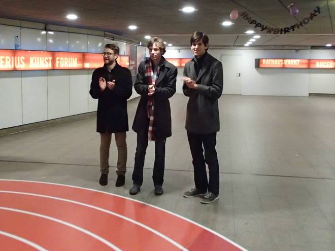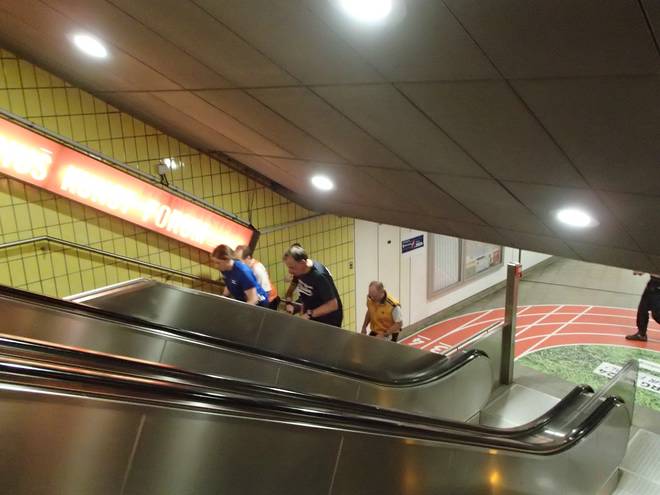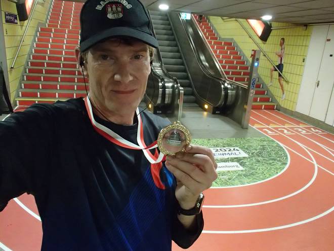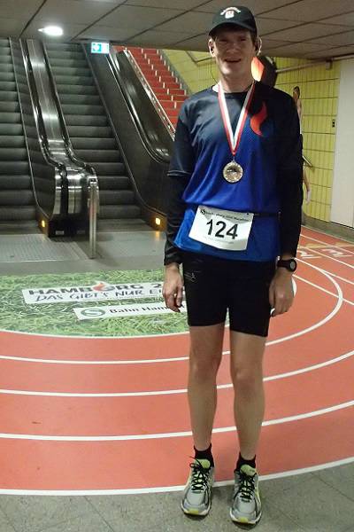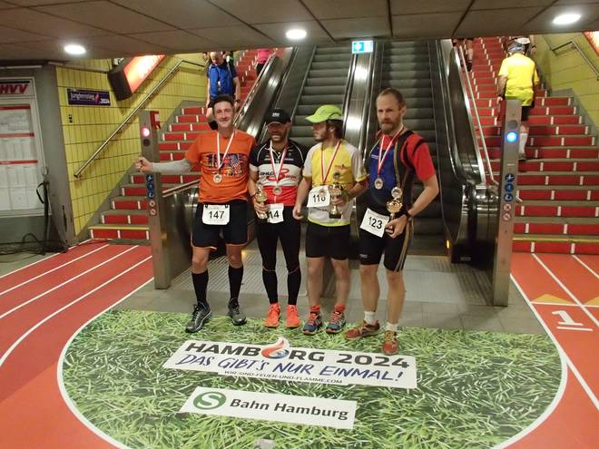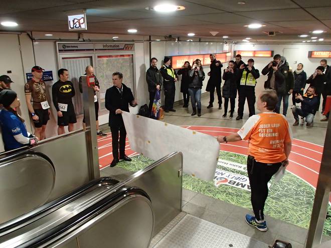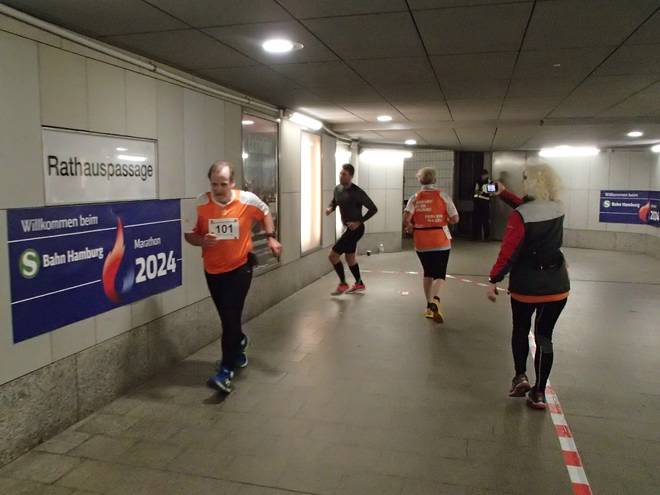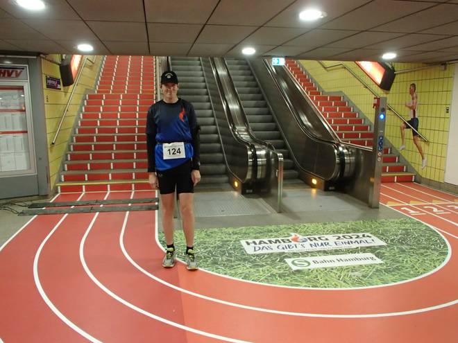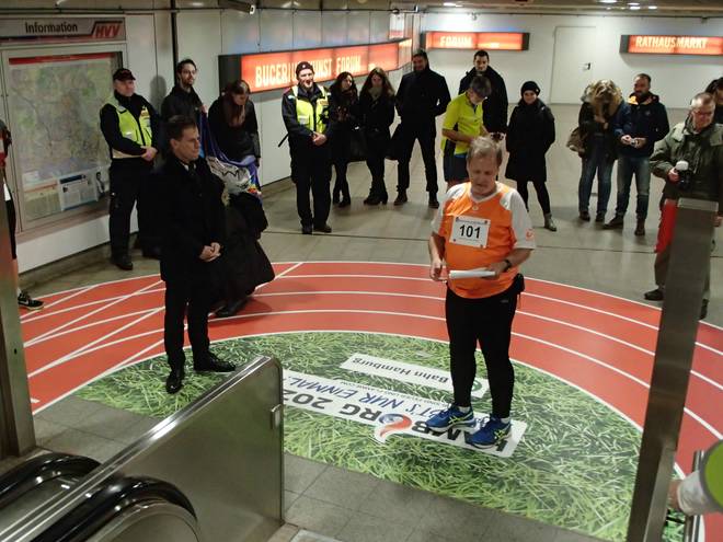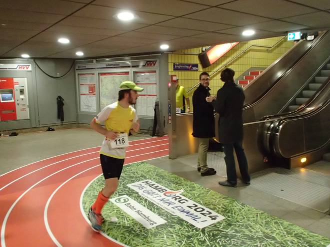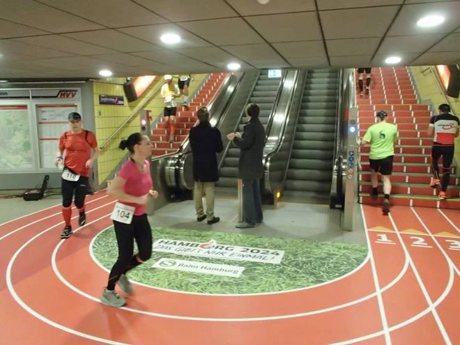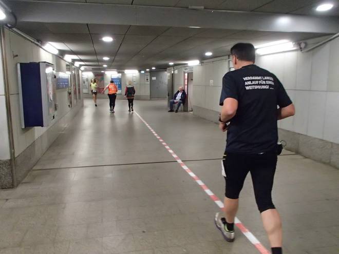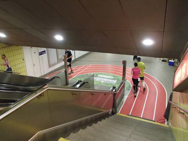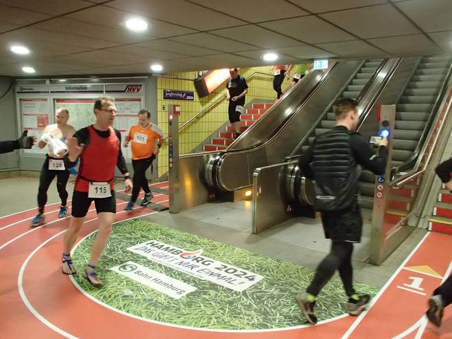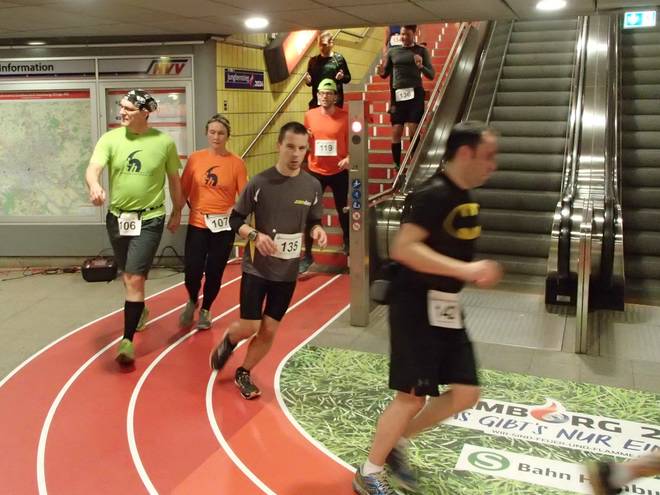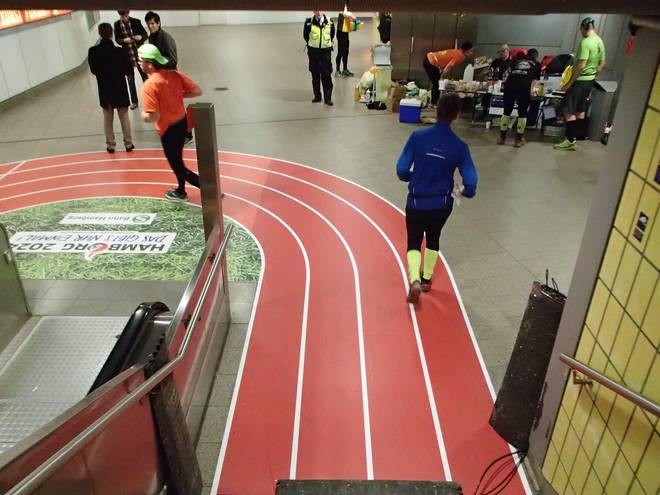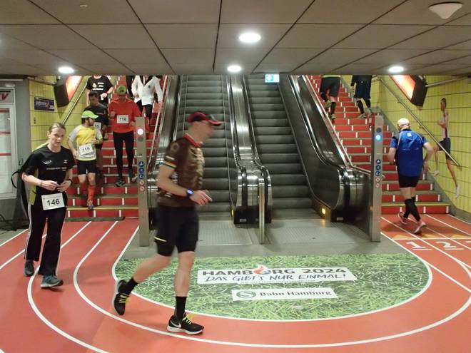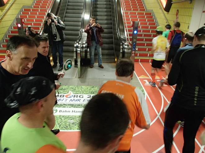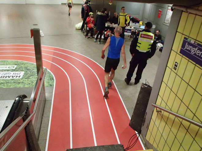 S-Bahn-Station Jungfernstieg Und dann erläuterte Christian noch einmal den Ablauf des Marathons: 302 Runden mit jeweils 140 Metern Länge, einer Kurve auf der Laufbahn hier unten, einer Haarnadelkurve oben im Gang, 34 Treppenstufen (entspricht 5,10 Höhenmetern) rauf und auch wieder runter. Zeitlimit: acht Stunden. |