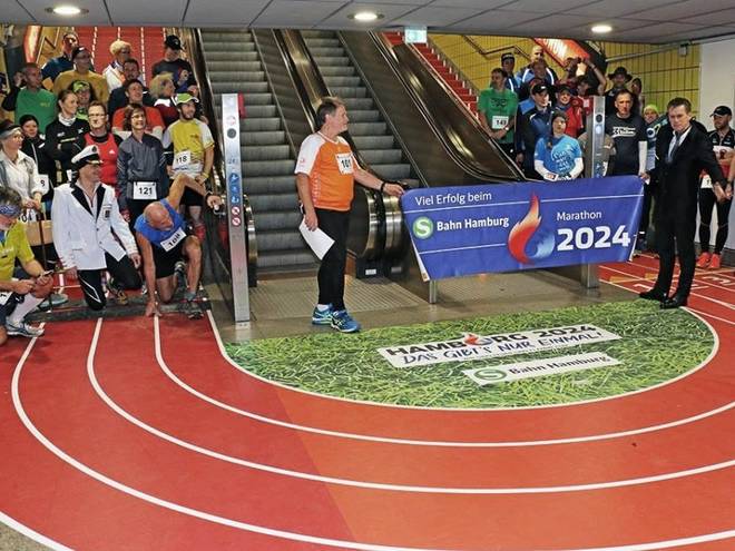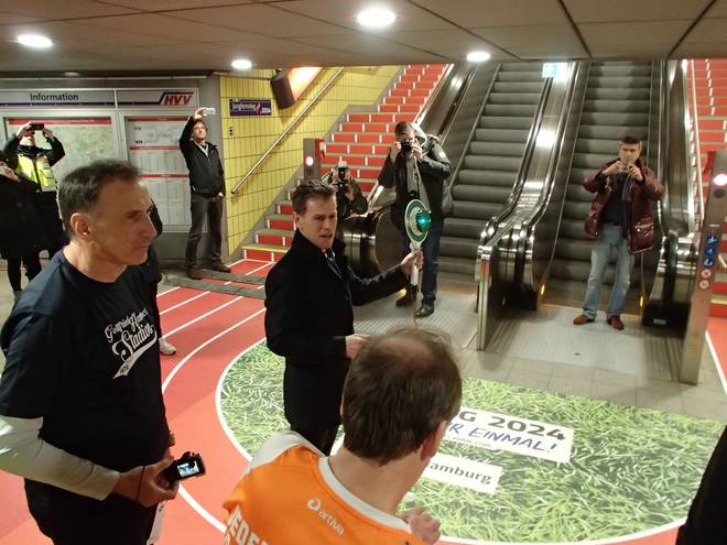S-Bahn-Station Jungfernstieg Mit einer Bahnkelle gab Herr Arnecke dann das Signal für den Start des S-Bahn Hamburg 2024 Marathon. |