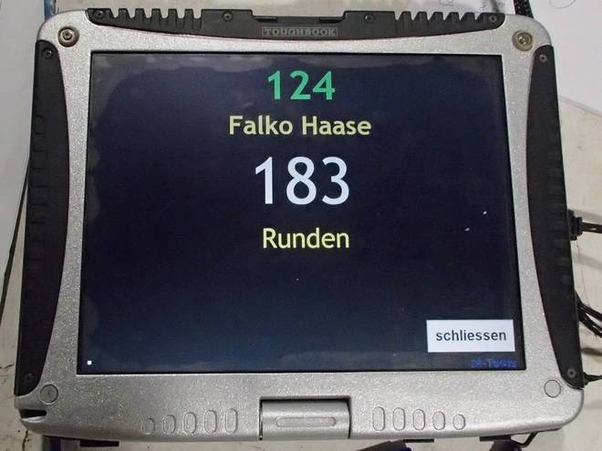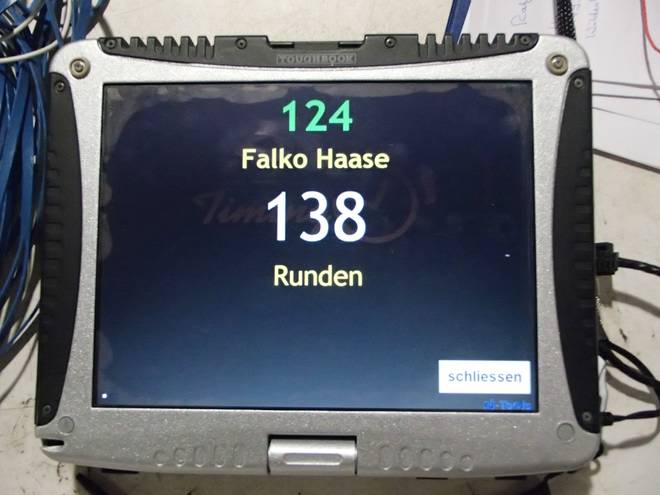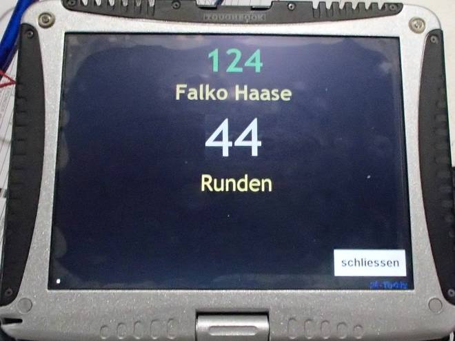 Runde 44 23.07 Uhr / Km 6,16 Aber es gab eine automatische Rundenzählung. Damit man seine Rundenzahn sehen konnte, mußte man allerdings am Verpflegungsstand seine Nummer auf den Monitor tippen. Das dauerte. Ich machte es nach jeder Stunde. |