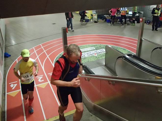 Runde 302 4.48 Uhr / Km 42,18 Aber jetzt nur noch schnell die Treppen hinunter fliegen... |