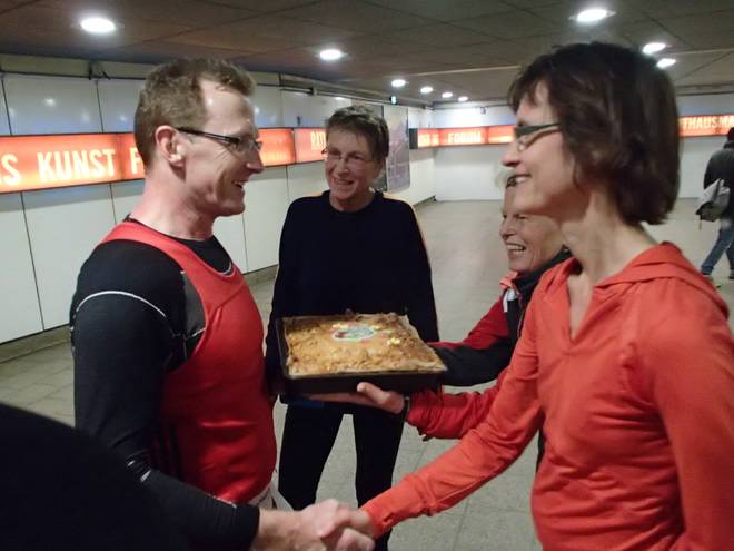 Runde 84 27. November 2015 0.00 Uhr / Km 11,76 Mitternacht war erreicht. Und damit war es Zeit, Ralf Vollmer zum Geburtstag zu gratulieren. Kuchen inklusive. |